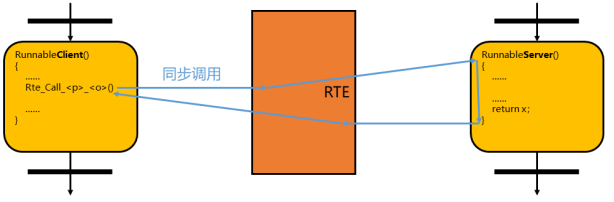 - 举个例子,我(客户),我想要执行一个函数,这个函数写在服务端上。由于我和服务端有隔阂(SWC 之间不能直接通信),这时,我就悄悄告诉 RTE,我想要执行那个函数,RTE 就会帮我告诉服务端,让服务端执行该函数。而这里又有异步和同步两种方式: