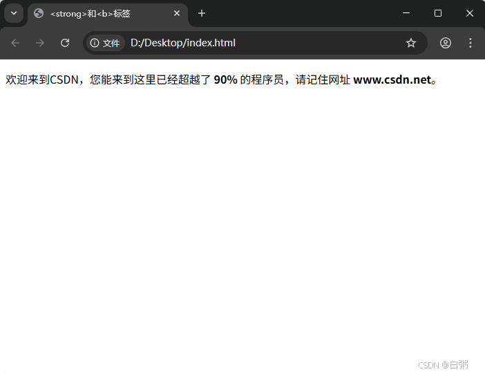 此处给90%添加 <strong> 标签是为了强调C语言中文网的重要性,以及它带来的震撼效果;而给网址添加 <b> 标签仅仅是为了视觉上的加粗效果,这样能引起读者的注意。