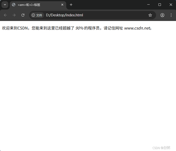 同上例一样,给90%添加 <em> 标签是为了强调C语言中文网带来的震撼效果,而给网址添加 <i> 标签仅仅是为了引起读者的注意。