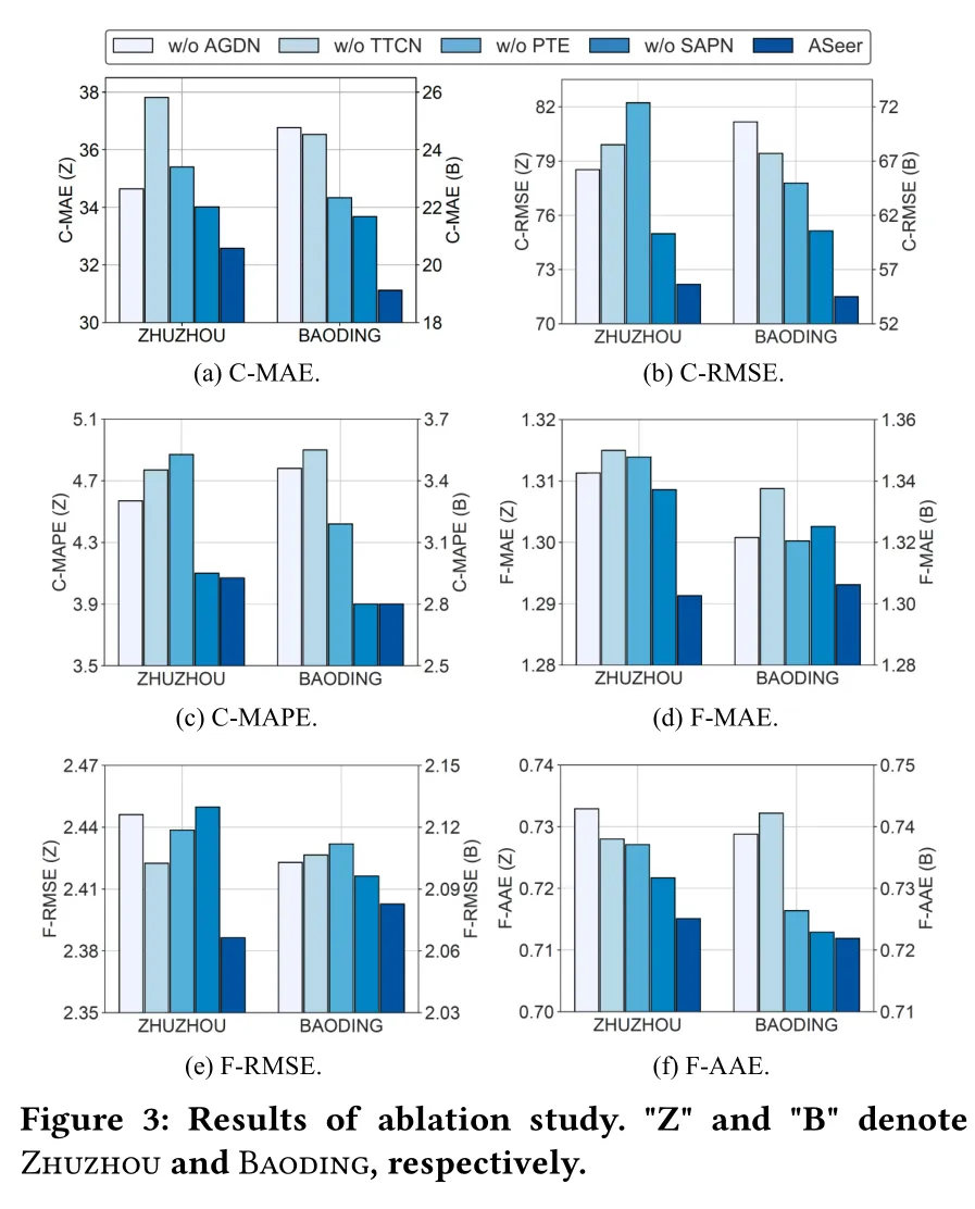 ASeer 在两个数据集的 6 项指标中均取得最优成绩(如表 1 所示)。例如,在株洲数据集上,C-MAE 达到 32.58,较最优基线模型 PDFormer(36.48)降低 10.7%;在保定数据集上,C-MAE 为 19.12,较最优基线模型 GWNet(26.50)降低 27.8%。这验证了 ASeer 在异步空间依赖、不规则时间依赖建模和变长序列预测上的优越性。