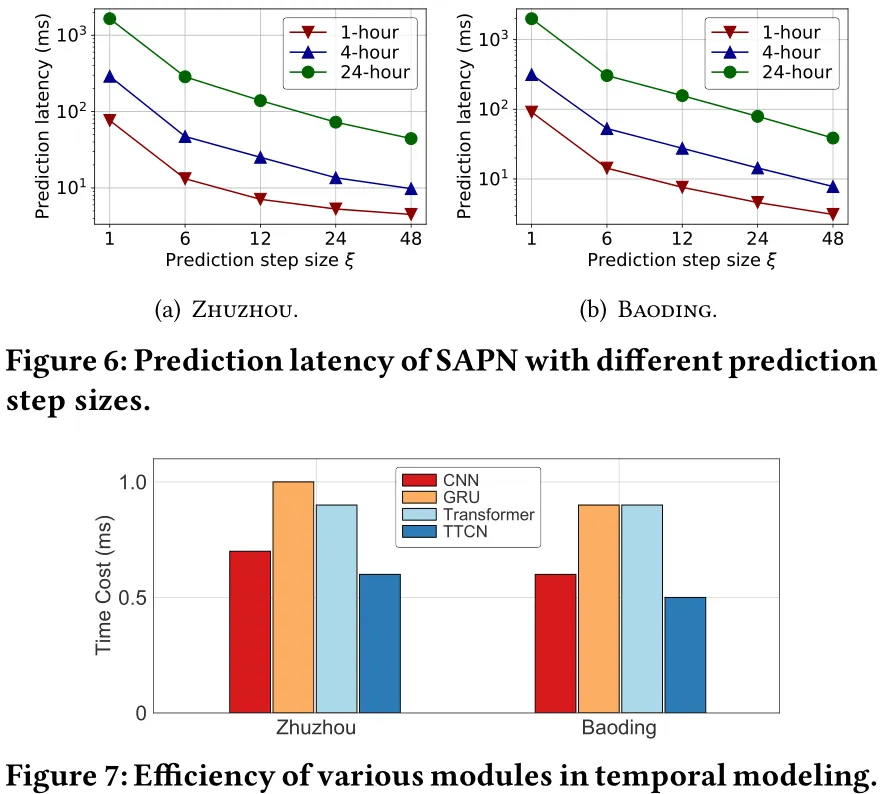 - SAPN 效率:相比全自回归模型,步长为12时预测 1 小时、4 小时、24 小时交通状态的 latency 分别降低约 90%、92%、95%,大幅提升预测效率;