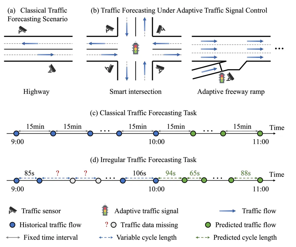 随着智能交通系统(ITS)的快速发展,精准的交通预测已成为现代城市交通管理的核心支撑技术,在应急响应、自动驾驶、交通信号优化等领域发挥着关键作用。交通预测的核心目标是基于历史交通数据,提前预判未来一段时间内的交通状态(如车流量、信号周期等),为交通管理部门和出行者提供决策依据。传统交通预测方法通常假设交通数据是按固定时间间隔采集的规则时间序列,然而在实际城市交通场景中,交通信号灯会在一天内发生多次调整 ------ 不同传感器的采集时间错位、时间间隔波动、预测序列长度不固定等问题,这使得传统方法预测精度大幅下降。