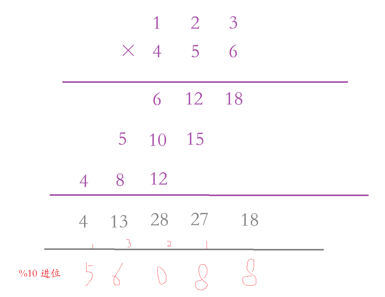 如果再遇到放到数组下标为 1 里面,或者说这个数组下标里面已经有元素了,则加等上去,例如:2 * 6 = 12