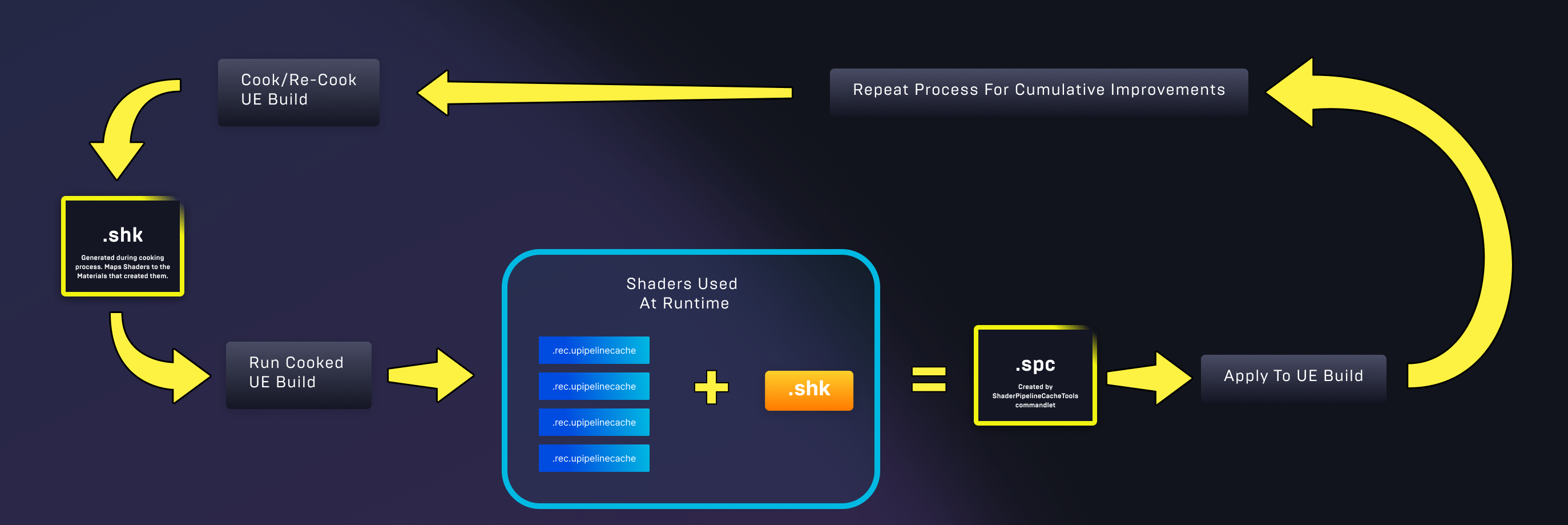 上图其中的 .spc .shk 是UE5用到的,本文只提UE4传统的PSO。对于UE4而言,如下图所示。这个过程追求高覆盖率 :为了达到最佳效果,你需要确保游戏运行时的PSO收集(即生成 .rec.upipelinecache文件的过程)尽可能覆盖所有的关卡、角色、特效和材质组合 。覆盖率越高,发布后玩家在游戏中遇到的意外卡顿就越少,从而避免在游戏过程中因实时编译PSO导致的帧率骤降和卡顿。