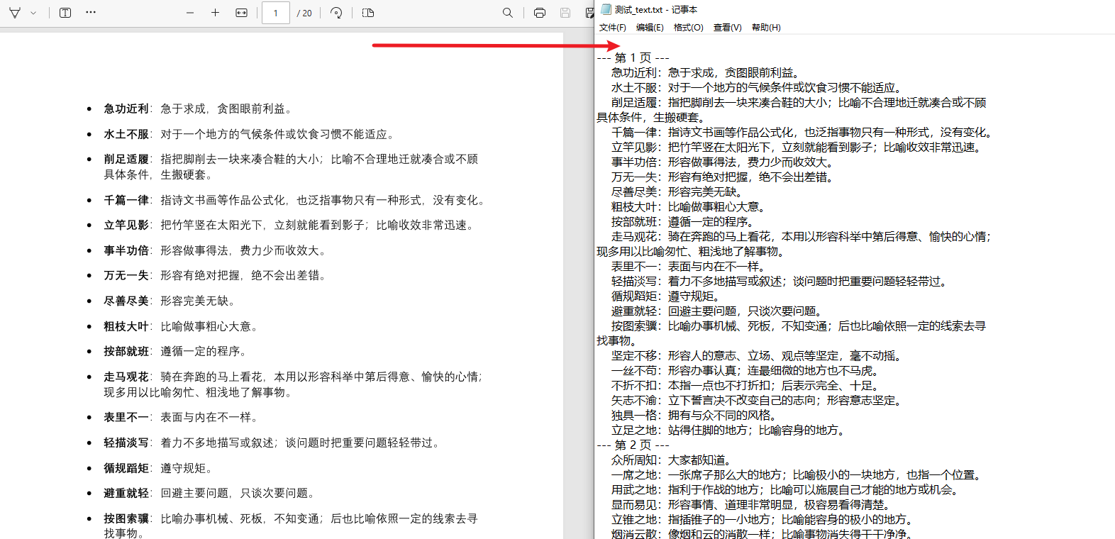 | 2 | 提取PDF文本 | 批量提取PDF所有页面文本,保存为UTF-8编码的TXT文件,按页码分隔文本内容 |