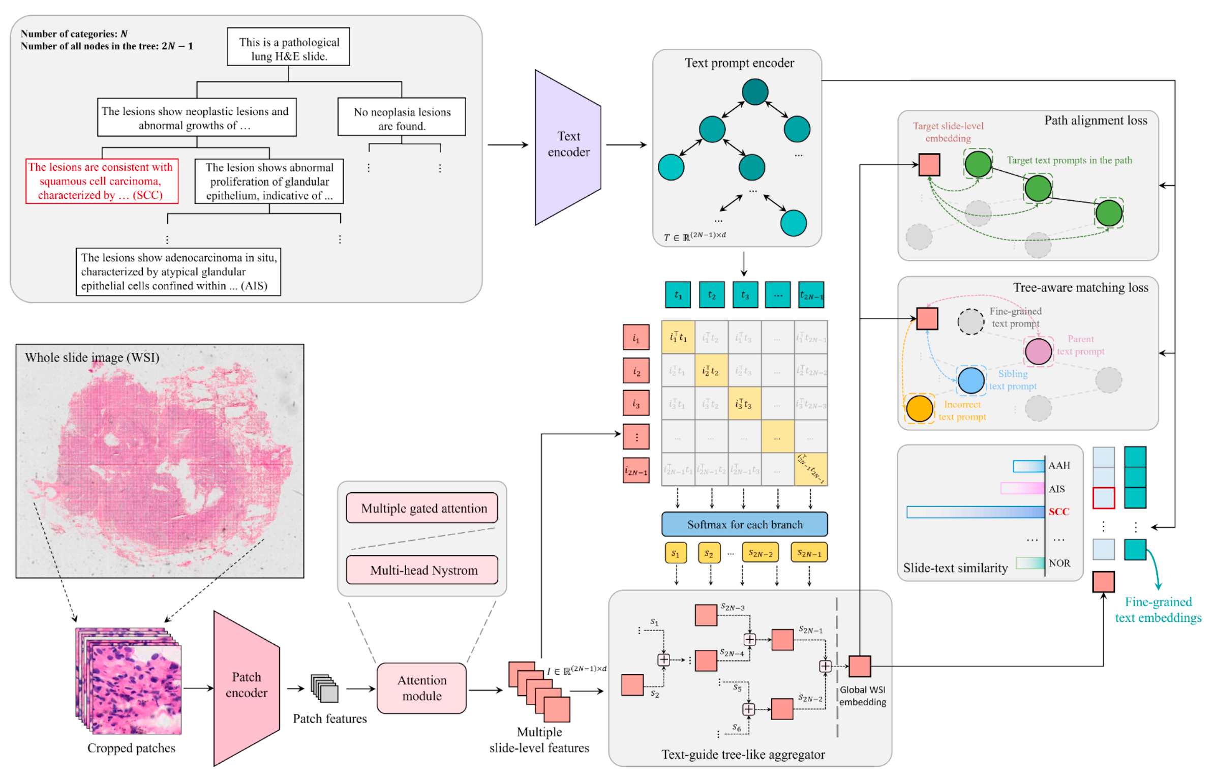 通过"路径对齐损失"确保图像特征与层级文本特征一致,用"树形匹配损失"区分相似病变类型,最后通过计算图像与文本的相似度得出诊断结果。