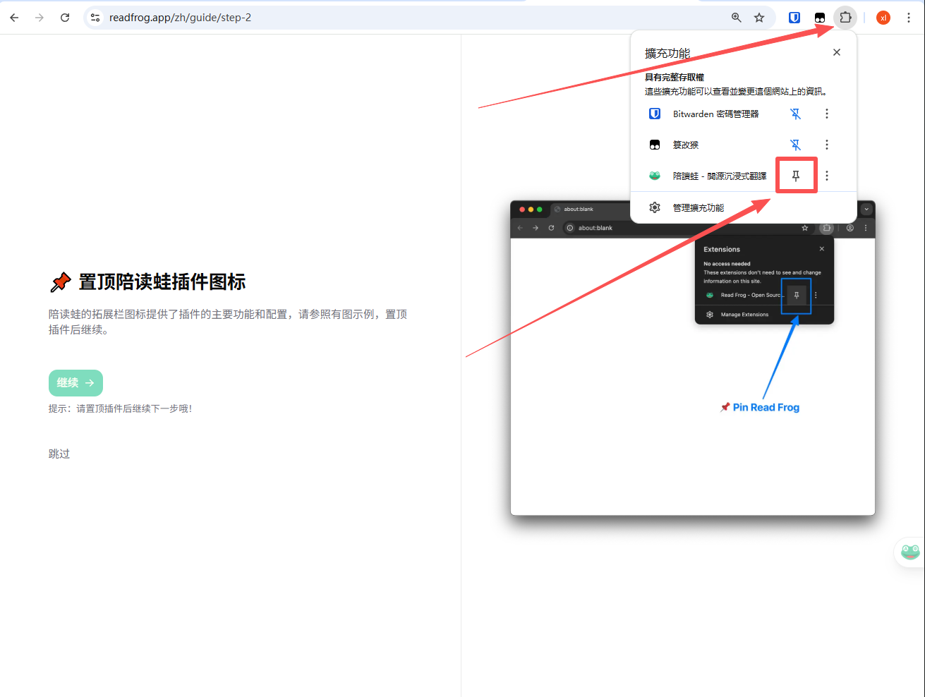 为了后续使用更加方便,建议将陪读蛙 Read Frog 固定在浏览器插件栏,方便随时开启或关闭翻译功能(如下图所示)。