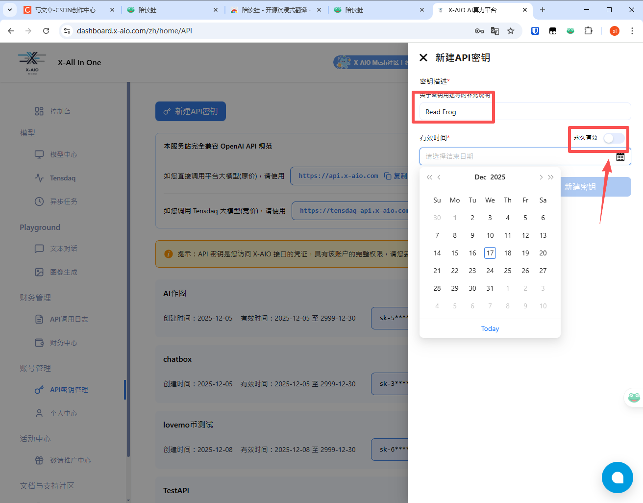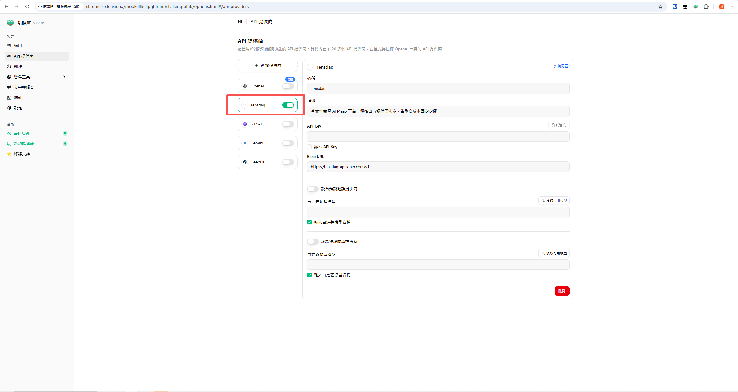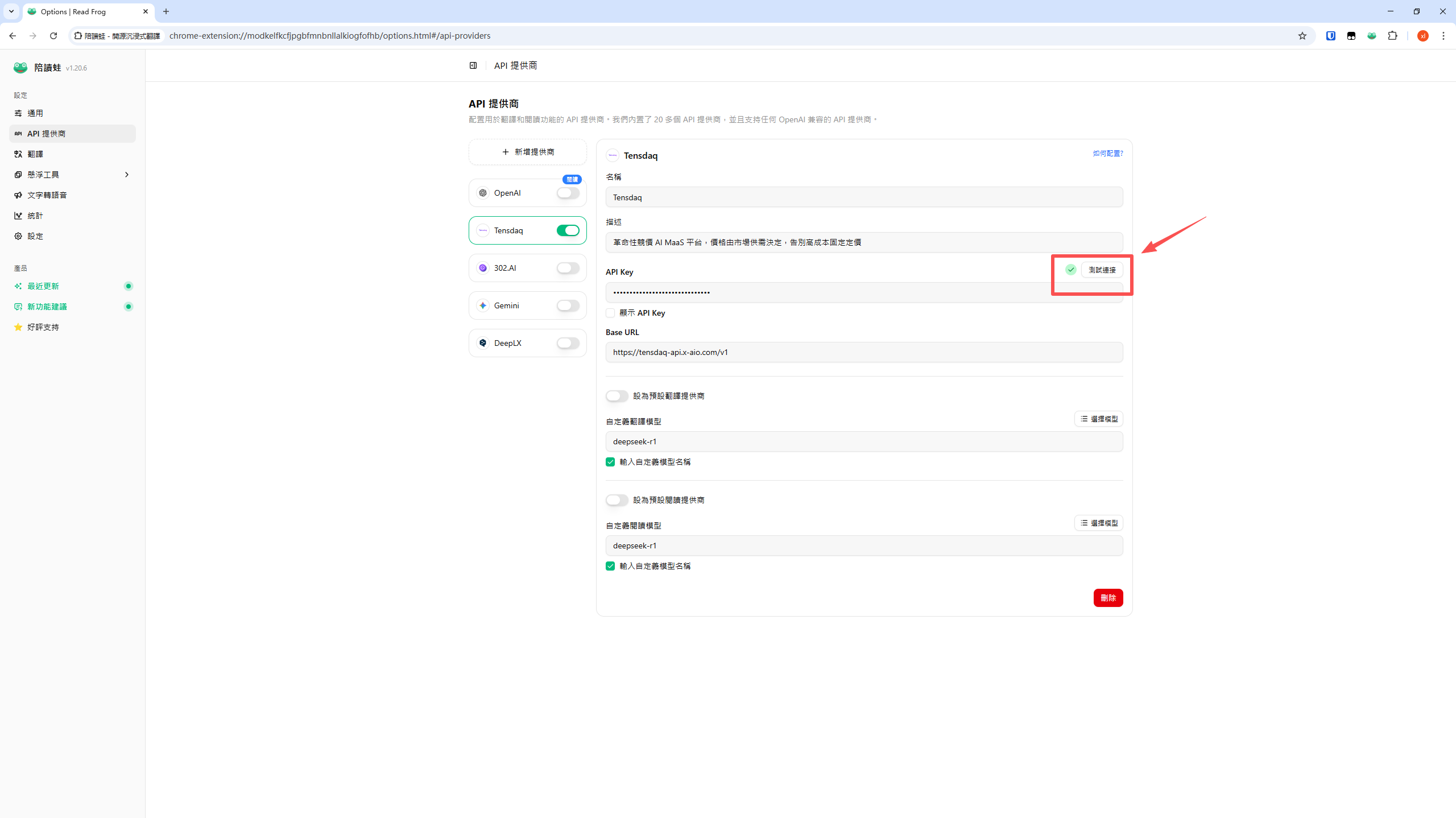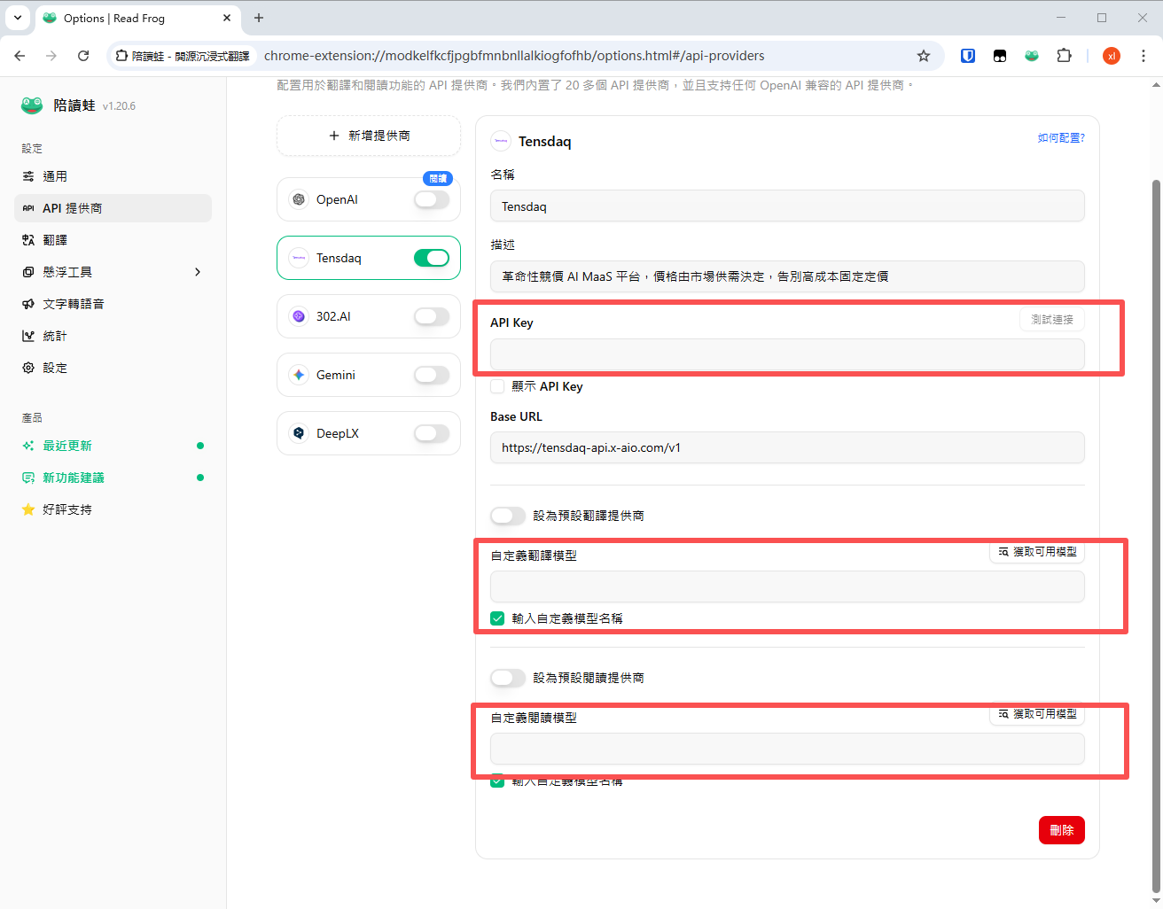 将刚刚复制的 Tensdaq API Key 粘贴到陪读蛙 Read Frog 的 API Key 输入框中。
