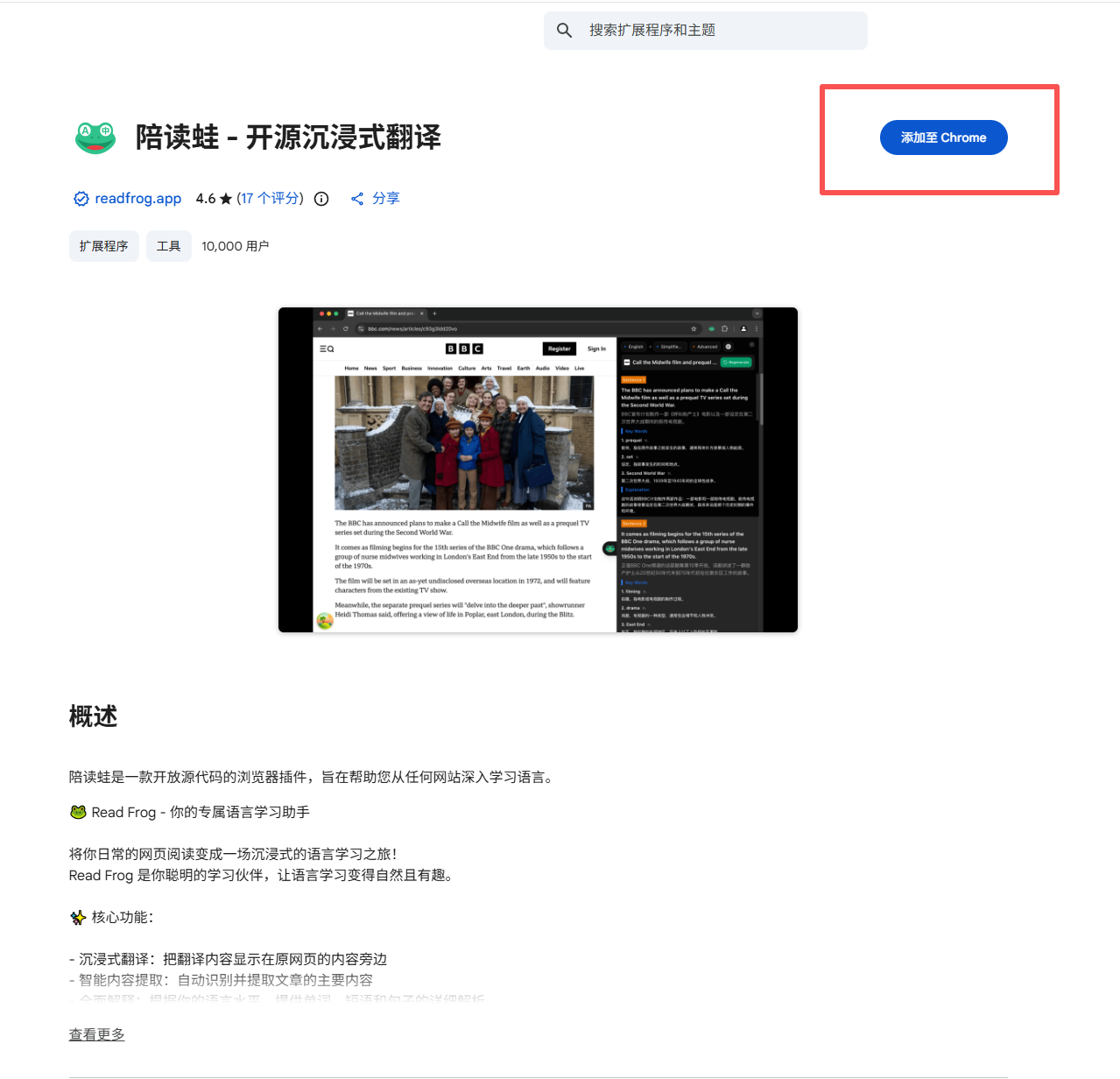 也可以直接在浏览器应用商店中搜索 Read Frog / 陪读蛙 进行安装(如下图所示)。