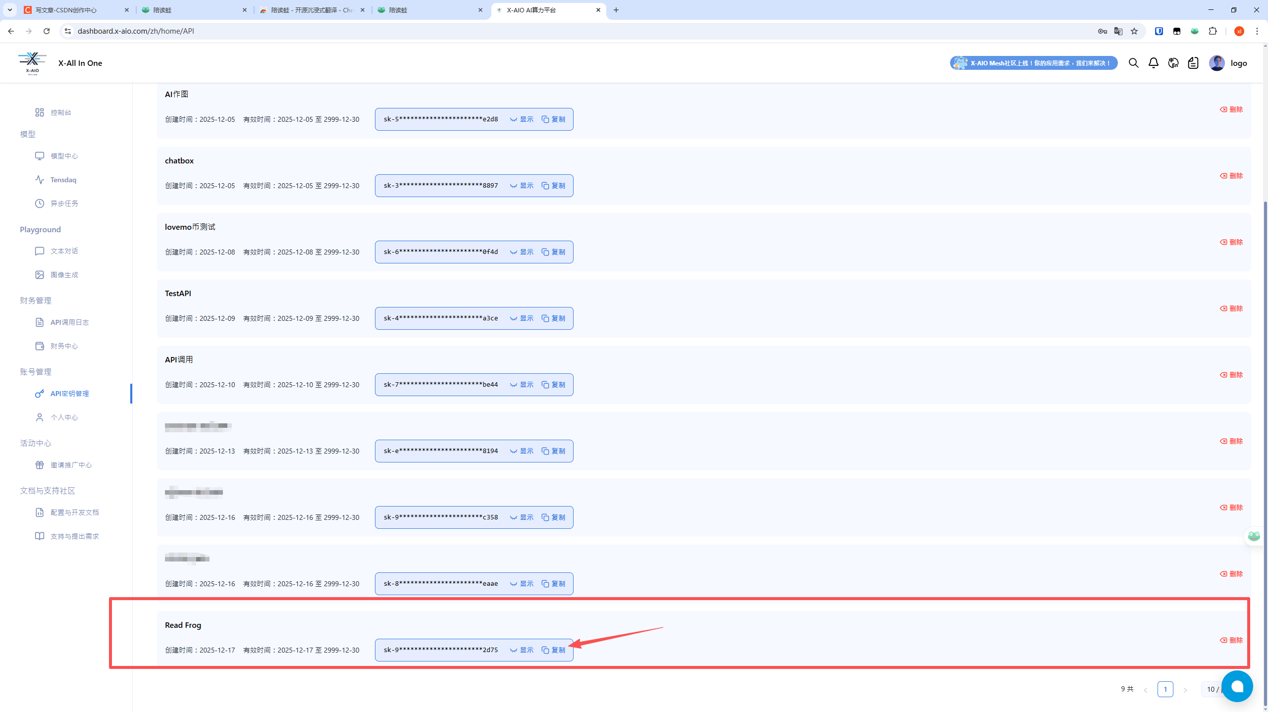 创建完成后,复制生成的 API Key(如下图所示)。