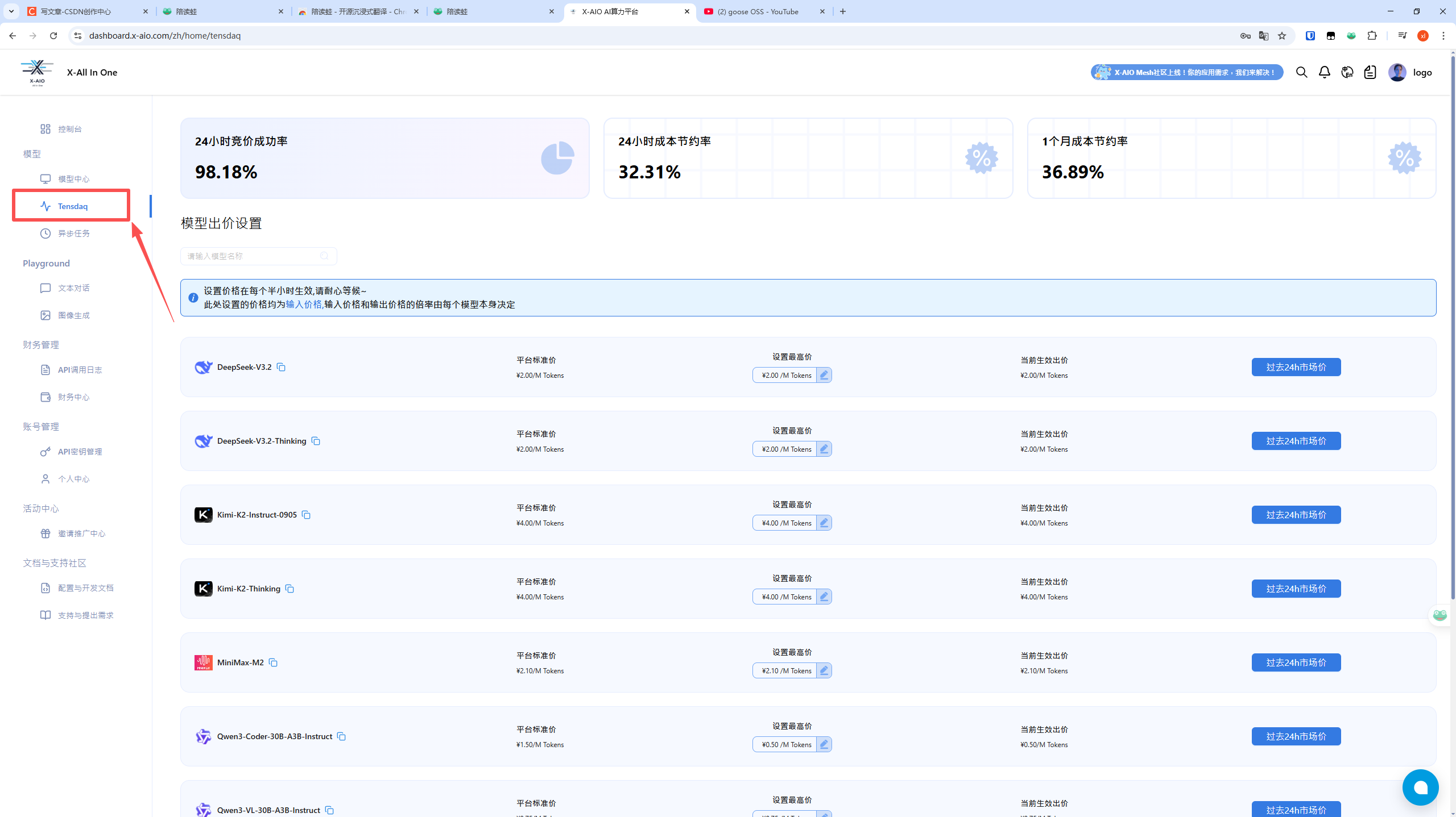 在 API 提供商列表中,开启 Tensdaq 作为 API 服务来源。