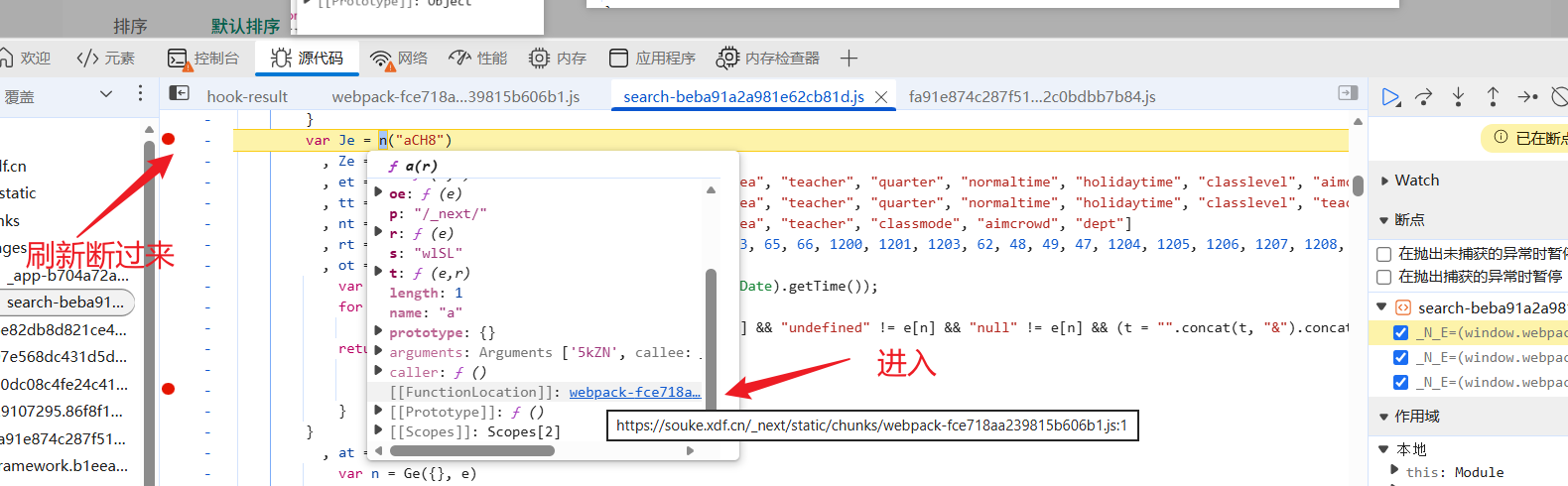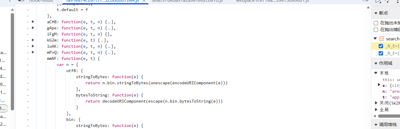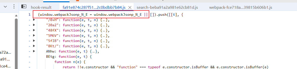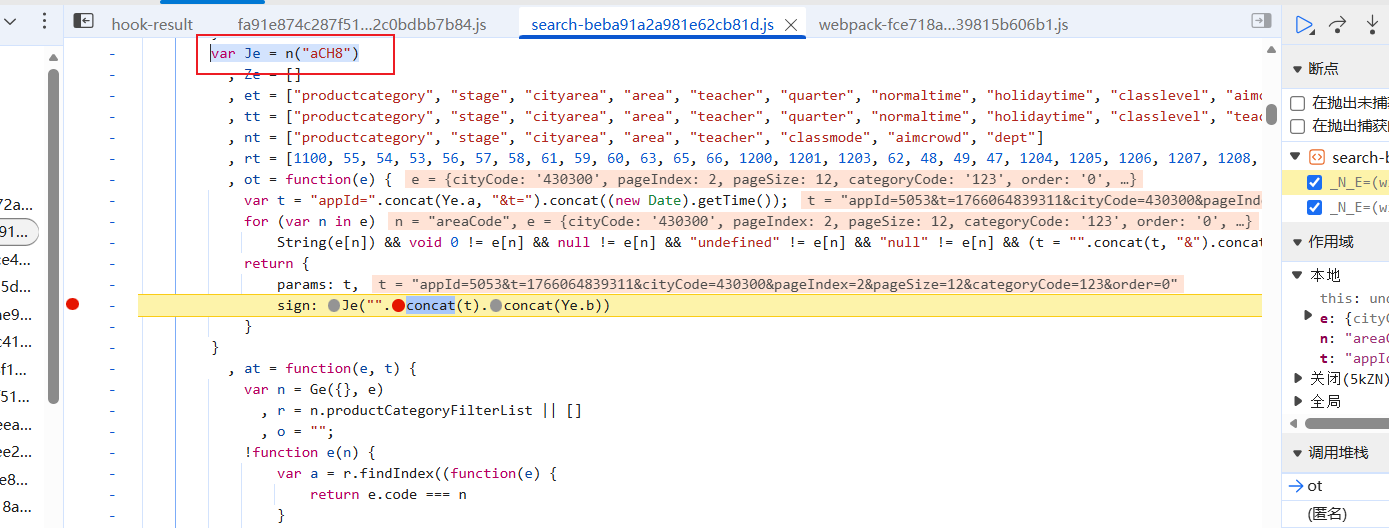 直接看sign生成的位置发现t竟然是刚才那个对象转化成的字符串,后面那个Ye.b是一个固定字符串,就差Je函数了,可以进去扣函数,但是进去一看就是webpack的模块存储文件,扣着可能会麻烦: