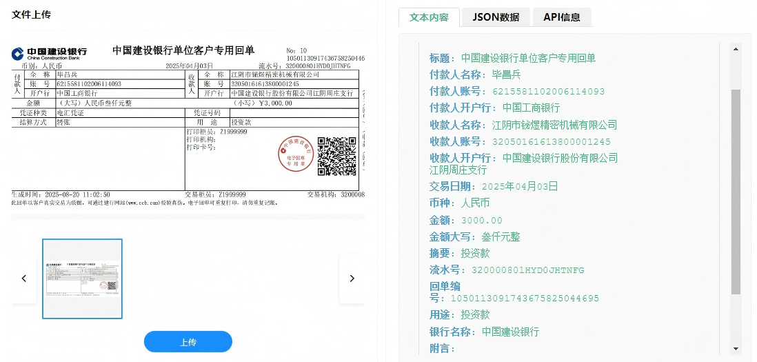 - 多格式自适应能力:系统能够智能识别并解析各类银行回单格式,无论是标准化的电子回单还是版式各异的纸质回单扫描件,都能准确提取关键信息。