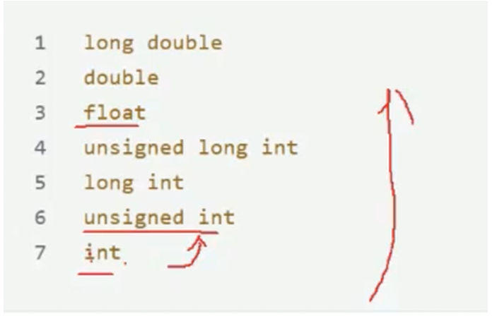 如果某个操作数的类型在上面这个列表中排名靠后,那么首先要转换为另外一个操作数的类型后执行运算。