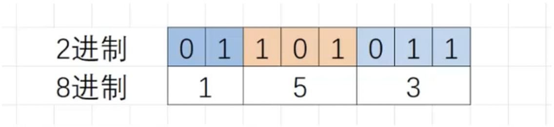 8 进制的数字每一位是 0~7 的,0~7 的数字,各自写成 2 进制,最多有 3 个 2 进制位就足够了,比如 7 的二进制是 111,所以在 2 进制转 8 进制数的时候,从 2 进制序列中右边低位开始向左每 3 个 2 进制位会换算一个 8 进制位,剩余不够 3 个 2 进制位的直接换算。