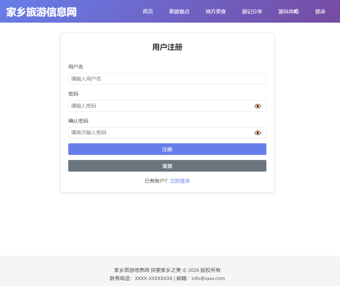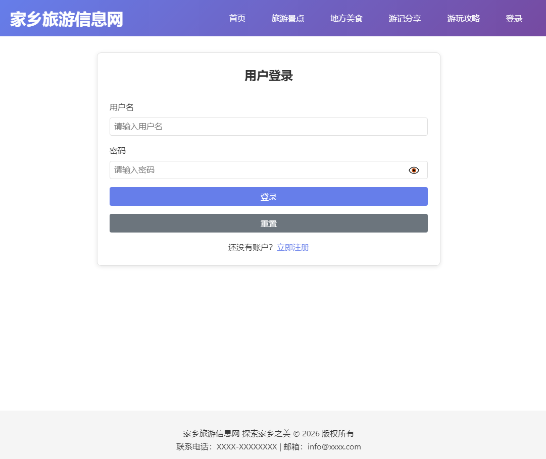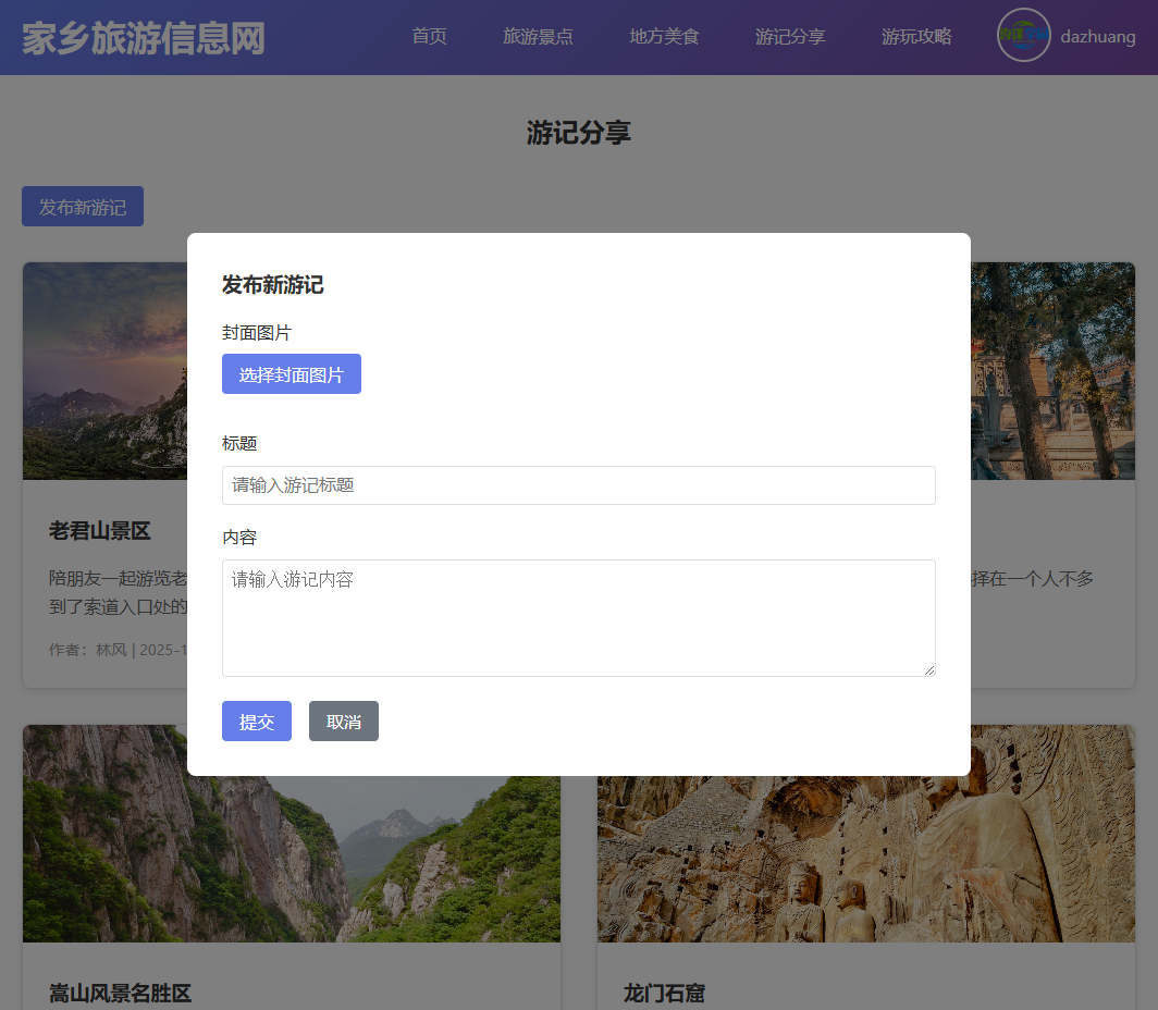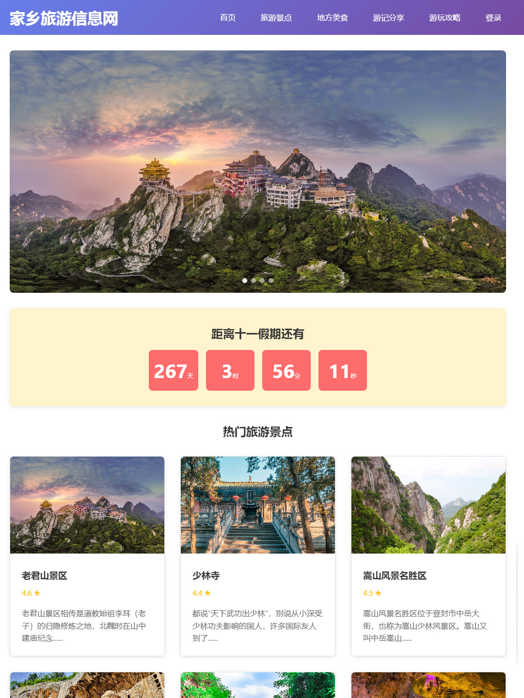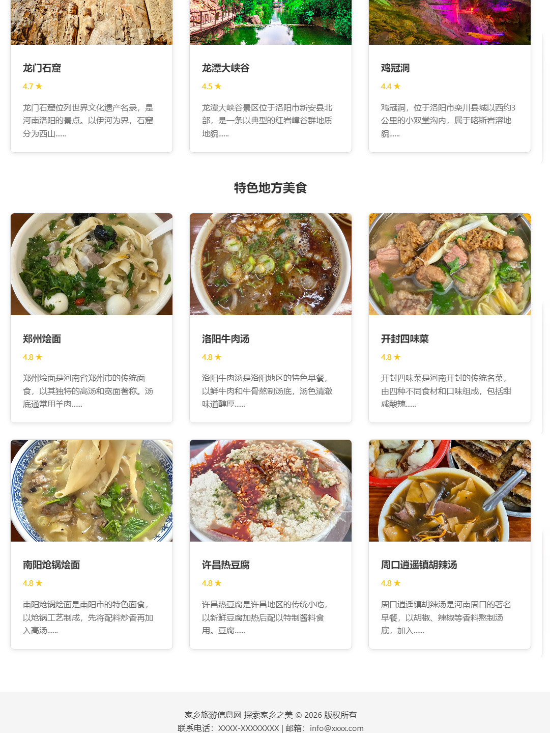 二级栏目页包括旅游景点、地方美食、游记分享、旅游攻略等