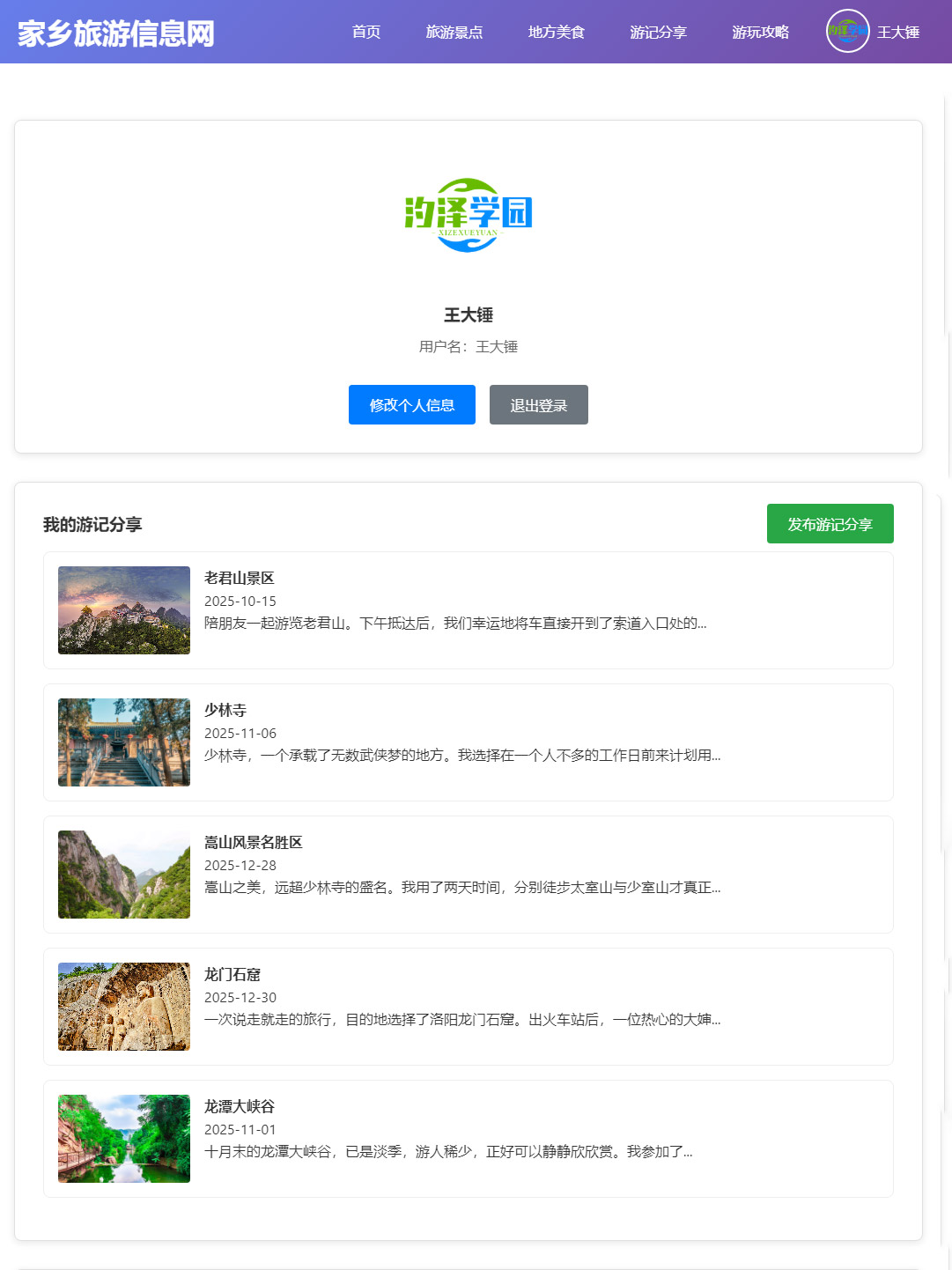 个人中心可以修改用户名称、头像,发布游记分享和游玩攻略。
