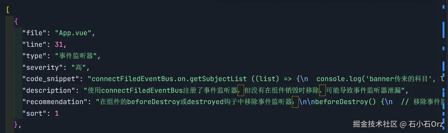 - 每条扫描结果包含该目录下 所有 JS / TS / Vue 文件 的潜在内存泄漏信息,数组形式存储。