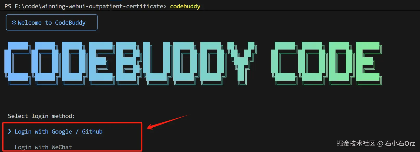 安装完毕后,控制台输入codebuddy,即可使用。第一次使用,需要登录,有两种登录方式: