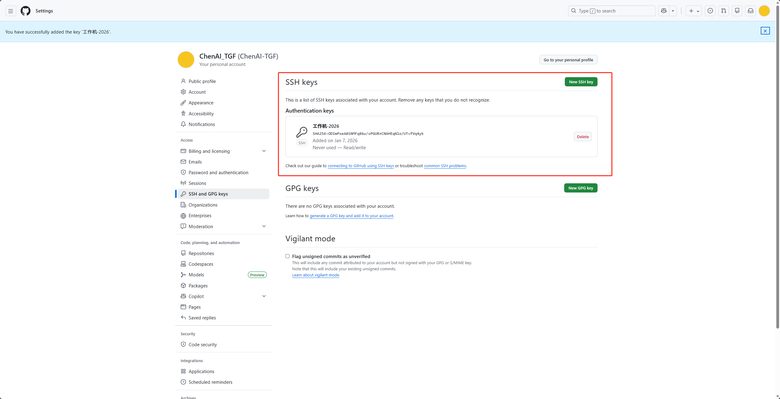 Add SSH key完成添加(若开启2FA,需验证身份)。