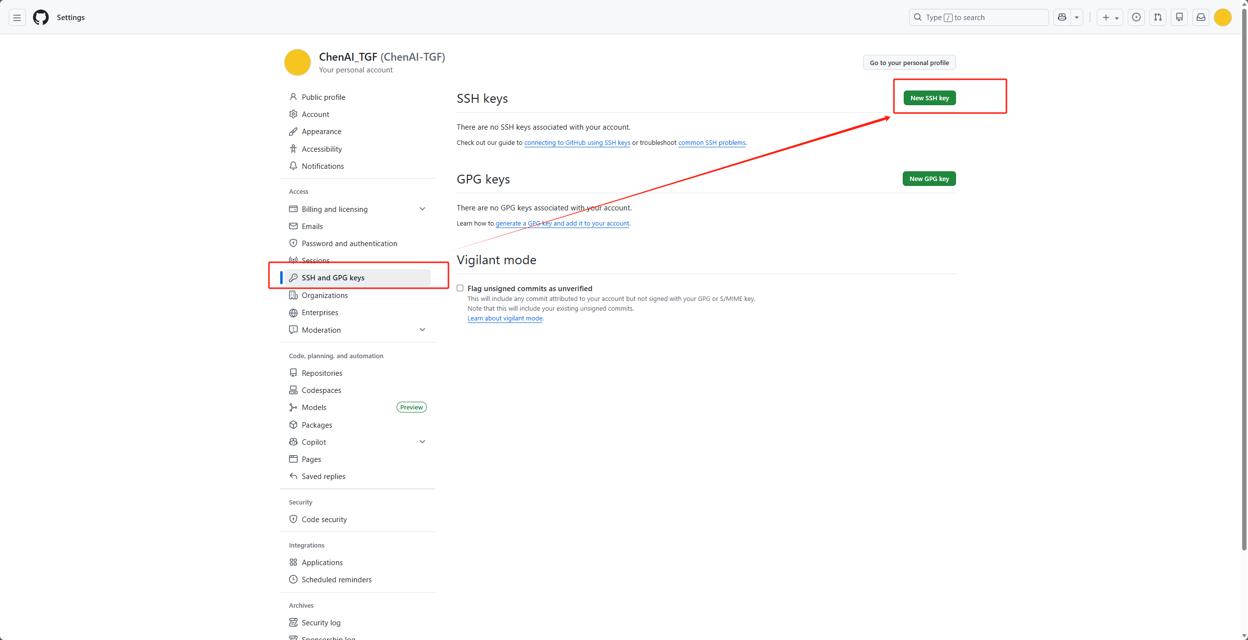 SSH and GPG keys→ 点击New SSH key;