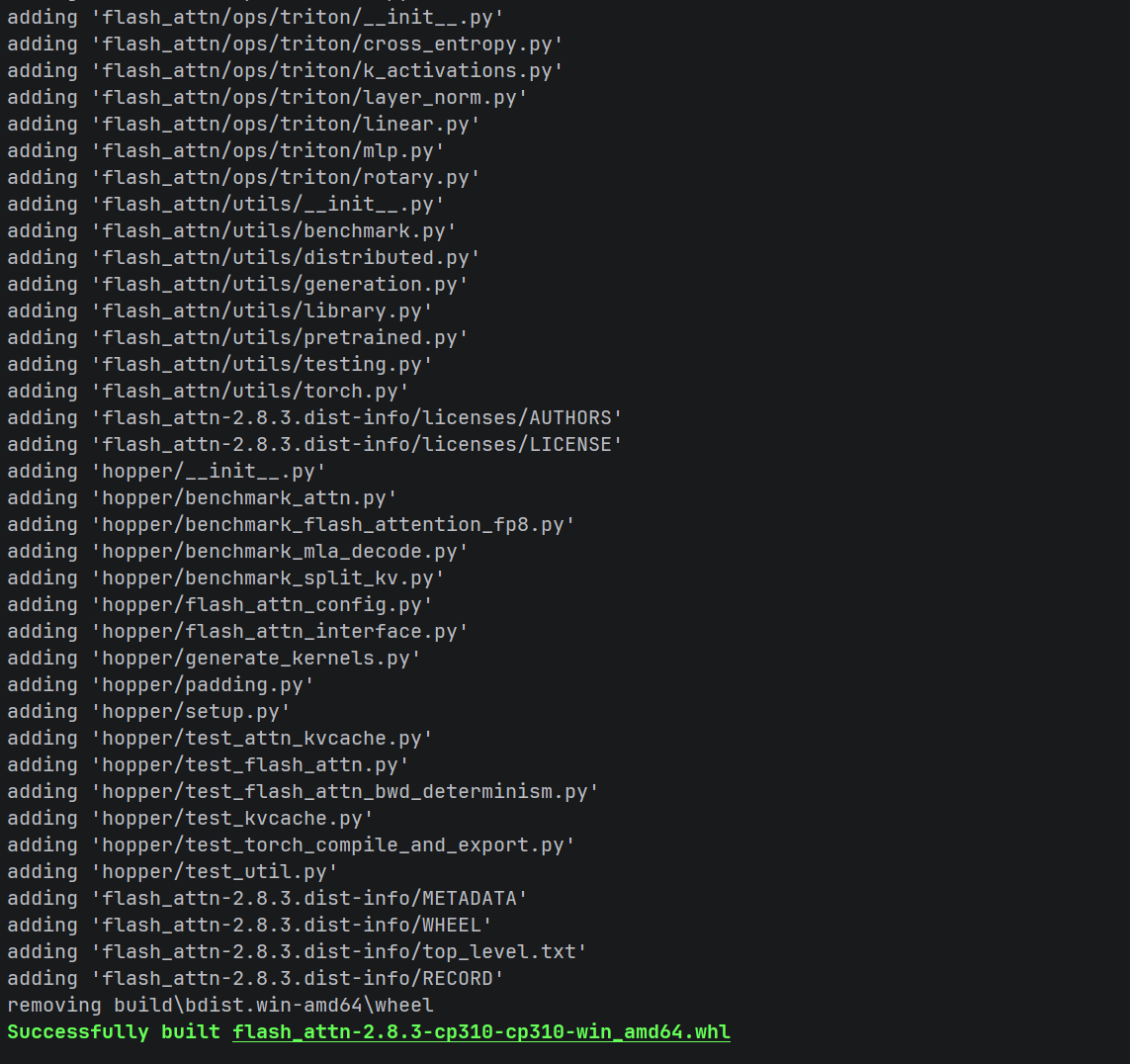 成功后会在 dist 目录生成: flash_attn-2.8.3-cp310-cp310-win_amd64.whl