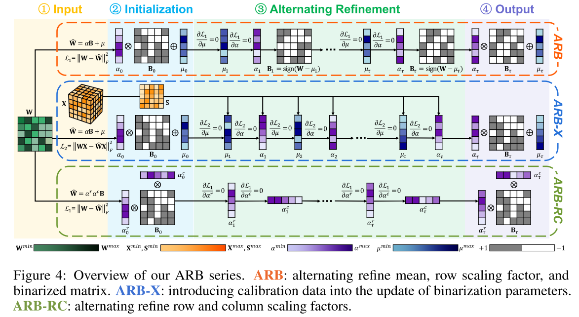 图4:ARB系列方法概述。ARB:交替精炼均值、行缩放因子和二值化矩阵;ARB-X:将校准数据引入二值化参数更新过程;ARB-RC:交替精炼行缩放因子和列缩放因子。