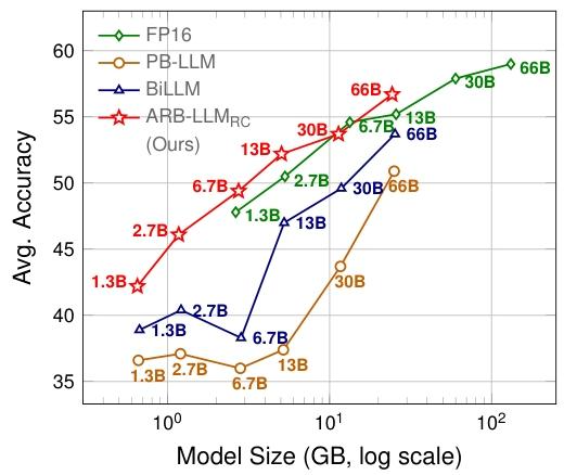 图 1:OPT 模型在 7 个零样本问答(QA)数据集上的性能表现。我们的 ARB-LLM_RC 模型优于同尺寸的 FP16 模型。