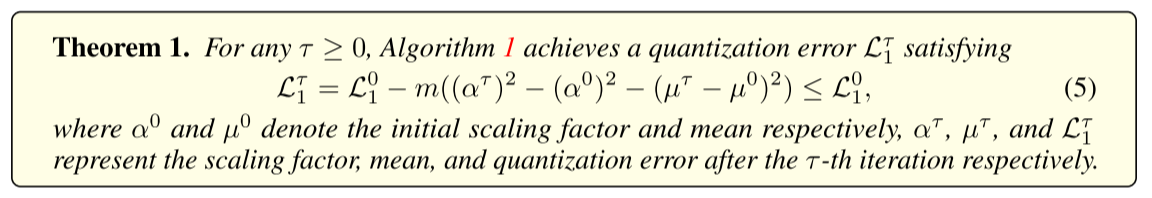精炼μ、α和B后,可得到\( \widehat{W}{refine }=\alpha{refine } \cdot B_{refine }+\mu_{refine } \)。我们发现该参数更新策略可扩展为迭代算法:在每次迭代中,依次更新μ、α和B,确保它们在当前量化误差\( \mathcal{L}_{1} \)下为最优解。伪代码见算法1(该算法通过组掩码扩展了ARB,组掩码为3.4节详细介绍的位图)。此外,我们对ARB过程中的量化误差进行了理论分析,推导得到T次迭代后量化误差的降低值(见定理1),证明过程见补充文件。