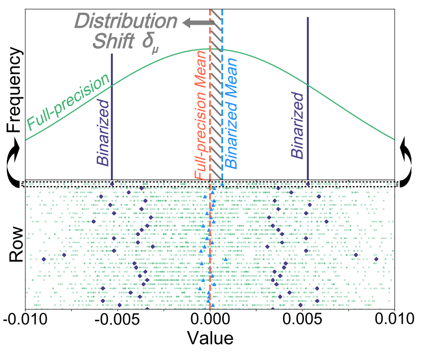 图 2:二值化权重与全精度权重的均值分布偏移。上图:单行的分布偏移;下图:多行的分布偏移。每行对应上图的俯视图。Distribution shift between the mean of binarized and full-precision weights. Top: distribution shift of one row. Bottom: distribution shifts of multiple rows. Each row represents a top view of the corresponding upper image.