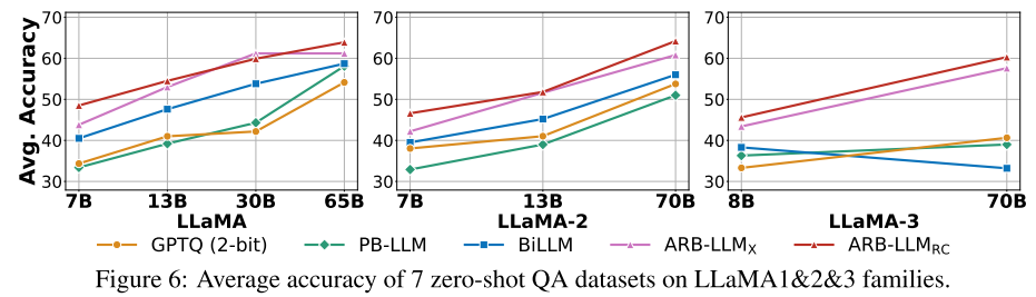 图 6 展示了 LLaMA1&2&3 系列模型在零样本问答任务上的平均准确率。结果表明,ARB-LLM_X 和 ARB-LLM_RC 均大幅优于 BiLLM,且 ARB-LLM_RC 的性能最为突出。此外,ARB-LLM_RC 在部分模型上(如 LLaMA-70B)甚至超越了 3 位量化的 RTN 模型,验证了其在低比特场景下的优越性。