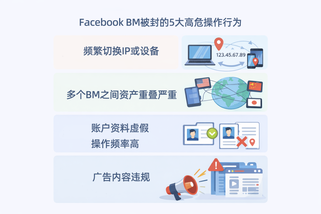 - 广告账户被封: 无法继续投放广告,且关联行为可能牵连BM。
