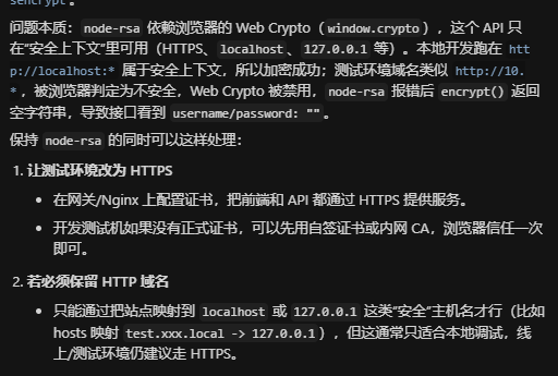 最终解决方案:放弃使用node-rsa,在util文件夹下建jsencrypt.js工具,代码如下,公钥私钥自己找。遇到这种类似问题,不要再多花时间了,使用jsencrypt加密不管什么环境都可以正常登录。
