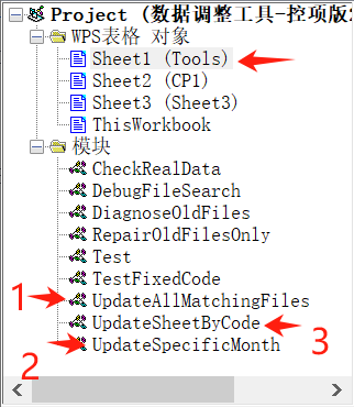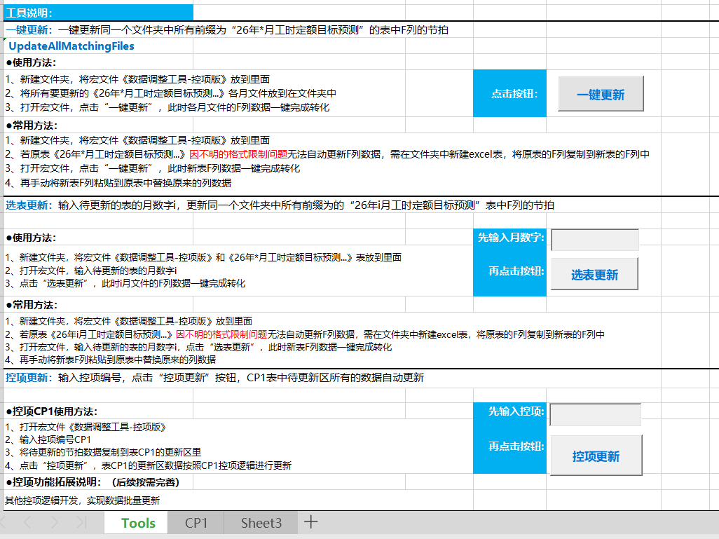 宏文件中,一键更新、选表更新、控项更新三种按钮都设置在sheet1(Tools)表中。