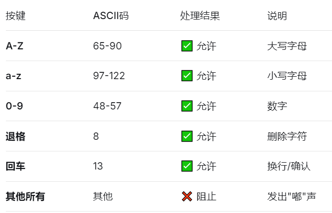 允许输入:字母(A-Z,a-z) + 数字(0-9) + 退格 + 回车