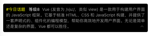 contentText="Vue (发音为 /vjuː/,类似 view) 是一款用于构建用户界面的 JavaScript 框架。它基于标准 HTML、CSS 和 JavaScript 构建,并提供了一套声明式的、组件化的编程模型,帮助你高效地开发用户界面。无论是简单还是复杂的界面,Vue 都可以胜任。"