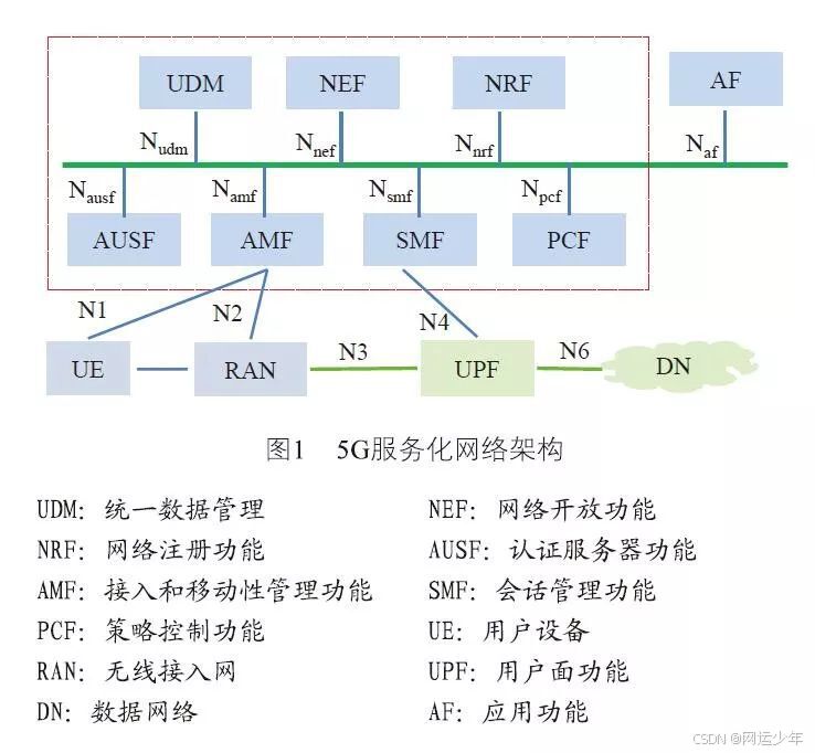 为了更好地满足差异化服务的需求,提高网络系统部署灵活性,降低网络建设运维成本, 5G网络采用了服务化网络架构 ,引入虚拟化、网络能力开放、网络切片等新技术,从而具备高度可定制性。垂直行业可以结合应用需求,基于开放的网络能力定制服务网络,并且可以灵活地对网络容量进行弹性伸缩,以应对动态变化的需求。 5G服务化网络架构如下图所示: