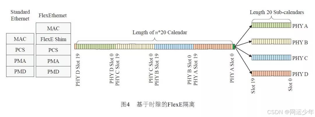 FlexE使用 Calendar分配每个子 Calendars上的66比特块给 FlexE客户(网络切片)。