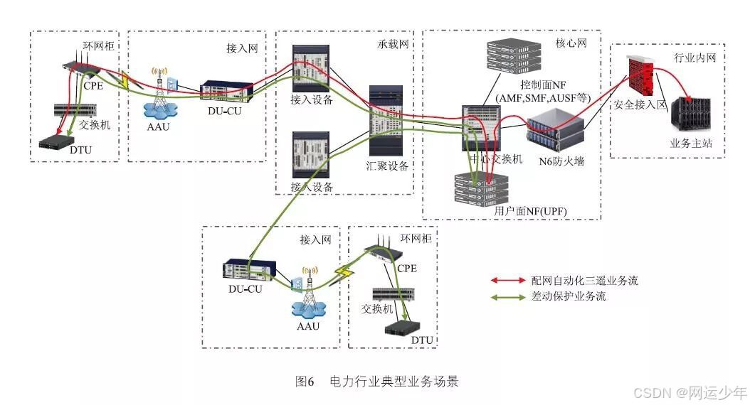 5G网络使用两张网络切片分别为上述业务提供网络服务。切片包含的所有网络功能都使用运营商电信云中独立的服务器加载,以实现电力业务与外界业务的物理隔离。