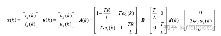 此外,永磁同步电机还是非线性、强耦合的系统。通过采用增量式模型, A(k)矩阵在相邻的电流环采样周期内也可以认为不变,因此A(k)可以写成A, 整个永磁同步电机模型可以看做线性模型。对于线性系统,状态方程等价于增量式状态方程,即: