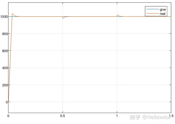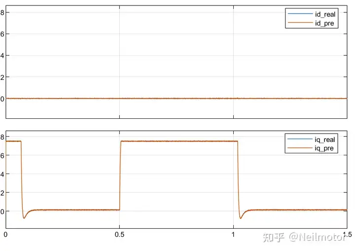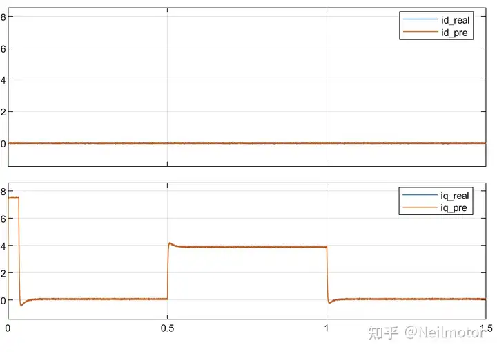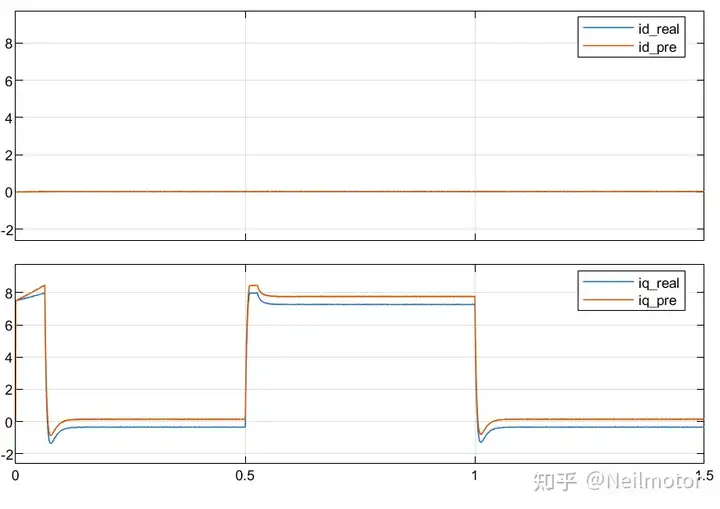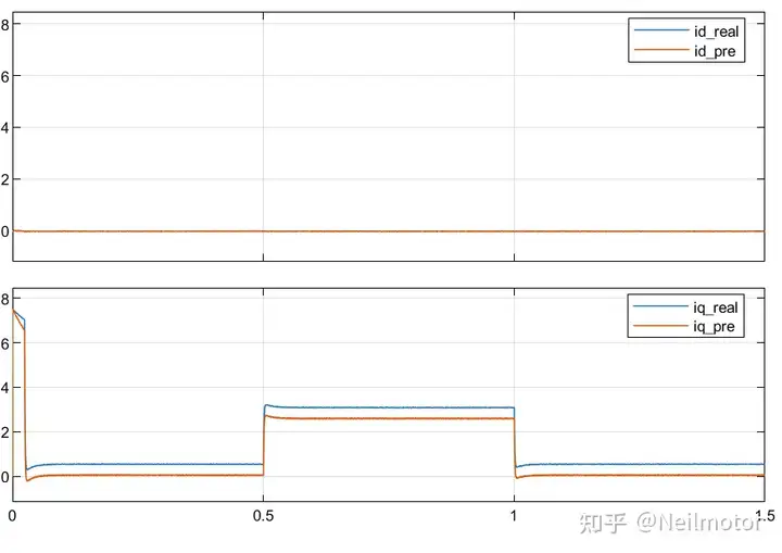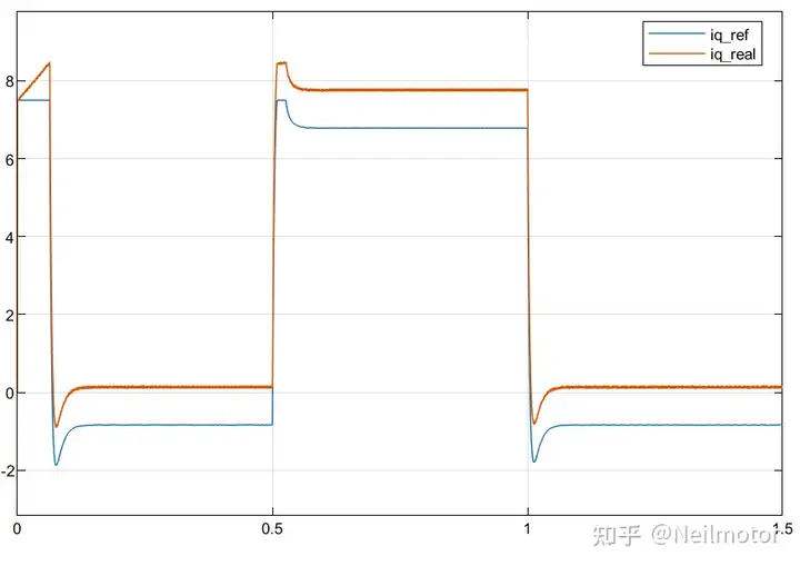 可能对比波形和理论分析,有人会疑惑,理论分析中"当电机正转,控制器中磁链大于实际值时,∆ψf>0,iq实际值大于指令;"而波形里面实际值更小。这是由于上图所示为电机反馈的实际值和MPC预测的电流值,下图才是实际值与控制器给出的指令,即iqref。也就是转速环控制器输出的控制量。可见实际效果与理论分析相符。