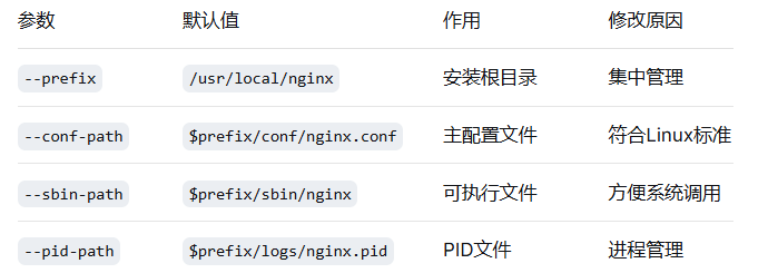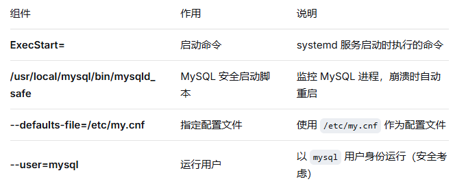 -DCMAKE_INSTALL_PREFIX=/usr/local/mysql # 安装主目录 -DSYSCONFDIR=/etc # 配置文件目录(my.cnf位置) -DMYSQL_DATADIR=/usr/local/mysql/data # 数据文件目录 -DINSTALL_MANDIR=/usr/share/man # 手册页目录