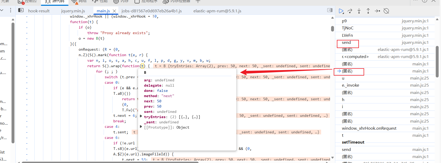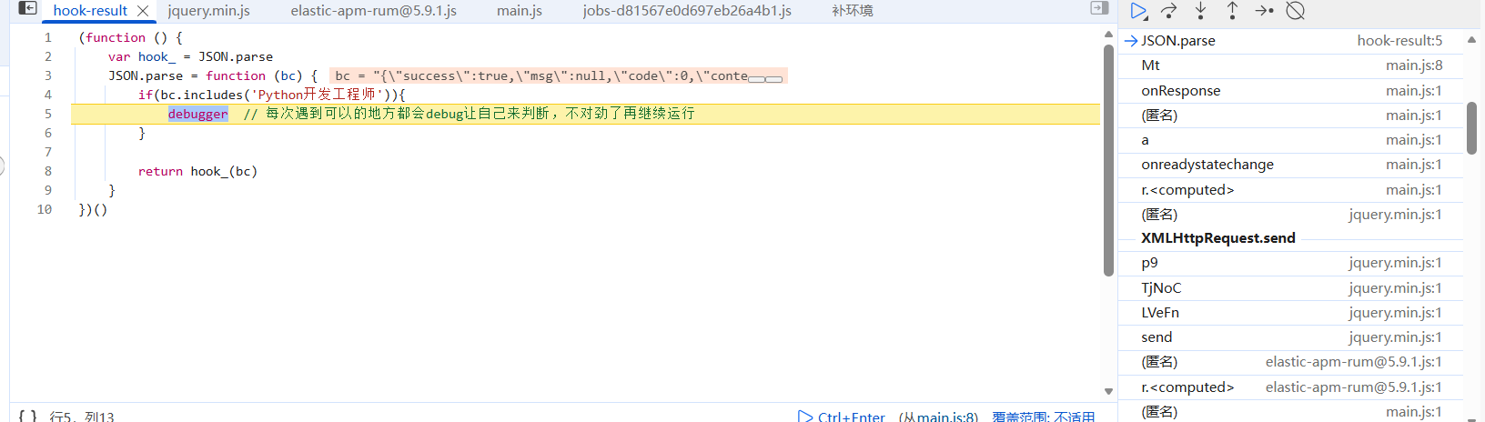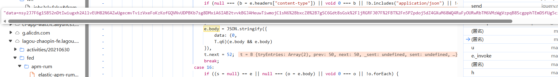 定位直接用hook,这里hook时没法翻页触发接口比较麻烦,咱们改一下hook断点的条件: