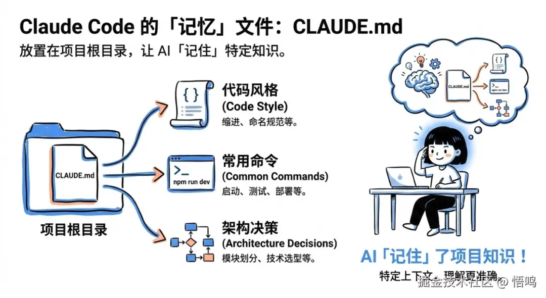 Claude Code 通过在项目根目录放置 CLAUDE.md 文件,包括代码风格、常用命令、架构决策等,让 AI 能够"记住"项目的特定知识。
