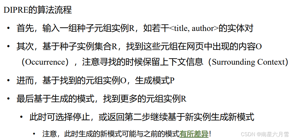 双重迭代模式关系提取(Dual Iterative Pattern Relation Extraction),由谷歌联合创始人Sergey Brin于1998年提出。其大致思路在于先给定一些已知关系类型的种子实体对,找到出现了这 些实体对的Occurrences,再学习Occurrences的模式(Pattern)。 进而,根据学到的模式,寻找更多符合该模式的数据,并加入到种子集 合中,不断迭代这个过程以实现关系抽取。