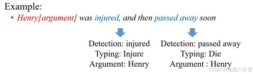 - 事件元素:事件的参与者,主要由实体、时间等组成。例如,前例中的Henry是事件的主体。