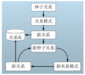 首先由种子关系生成关系模式,然后基于关系模式抽取新的关系,得到新关系后,从中选择可信度高的关系作为新种子,再寻找新的模式和新的关系。如此不断迭代,直到没有新的关系或新的模式产生。