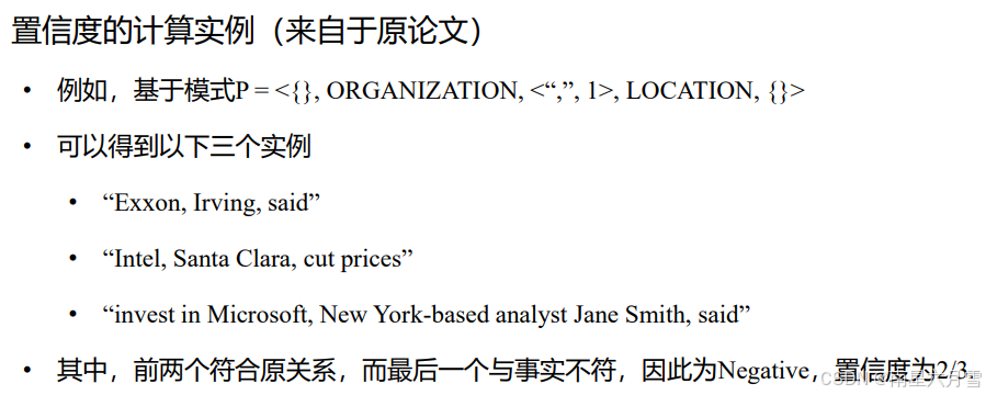 - 置信度(Confidence),按照如下公式计算,即考虑符合该模式的元组,确实符合相应关系的概率。
