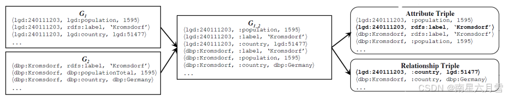 那么如何使关系表征拥有统一的向量空间?可以利用相似性合并。首先,找到部分相似的谓词,例如,bornIn(KG1)与wasBornIn(KG2),并用统 一的命名方案(例如,bornIn)重新命名,将KG1和KG2合并为KG1_2。接着,合并后的图KG1_2被分割成关系三元组Tr和属性三元组Ta,用于表征学习。