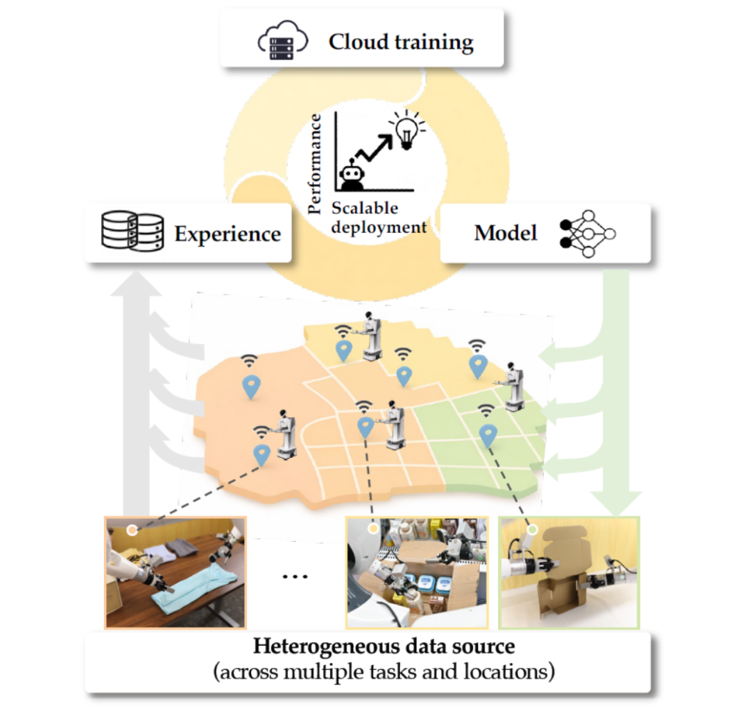 机器人集群在各类任务中持续采集经验数据,将交互数据实时传输至中心化云端服务器,并异步接收更新后的控制策略------ 使 VLA 模型在保持通用性的同时,提升各任务的执行熟练度。